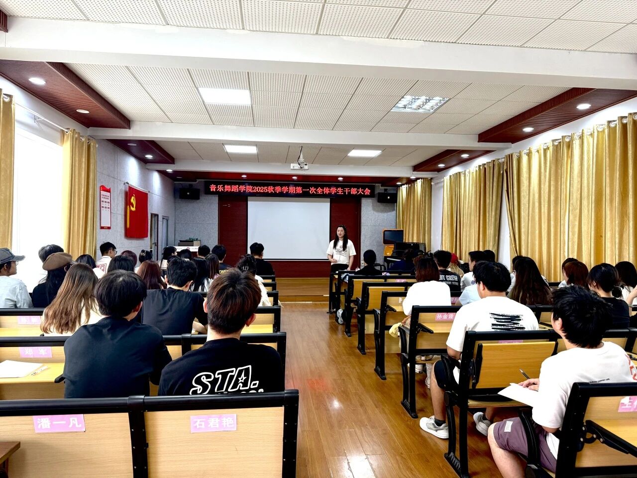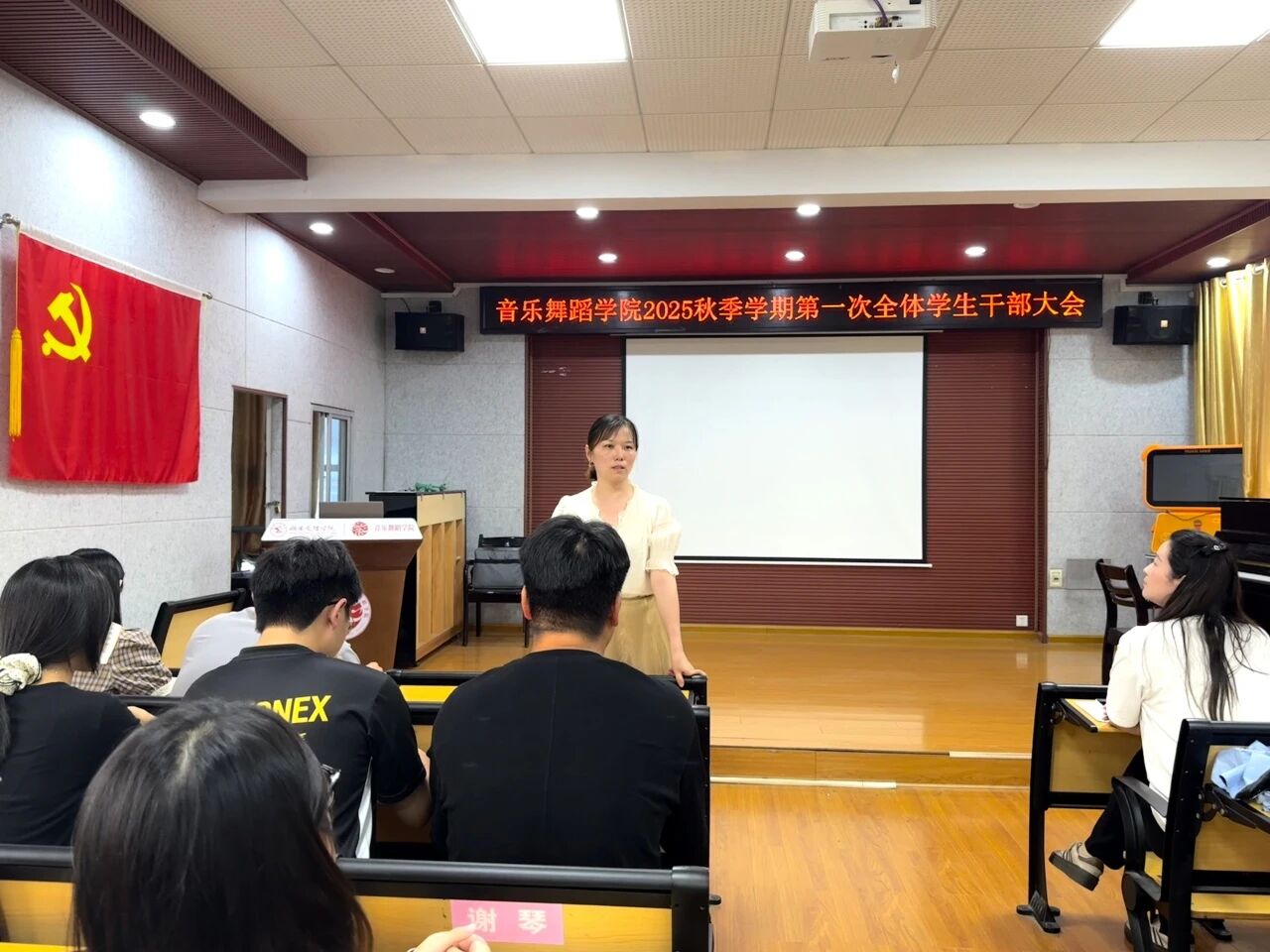 凝心聚力担使命,奋楫扬帆启新程。2025年9月6日下午音乐舞蹈学院在艺术楼B105召开2025年秋季学期第一次全体学生干部大会,参加会议的有党总支副书记丁洁、学工办全体老师和全体学生干部。本次大会全面汇报总结了暑假工作,并对新一学年的重点工作任务进行了部署与展望,激励全体学生干部要以更饱满的热情、更昂扬的斗志投身于服务同学、丰富校园活动的实践中来。